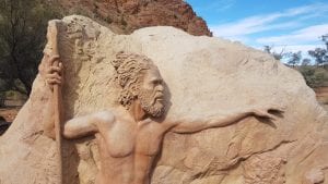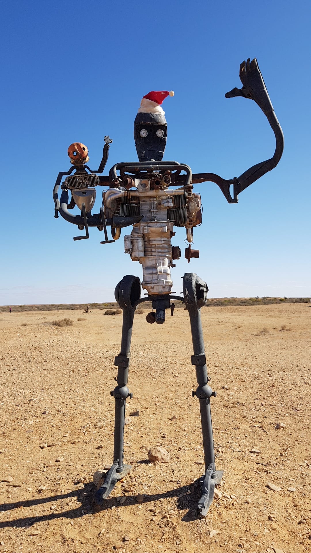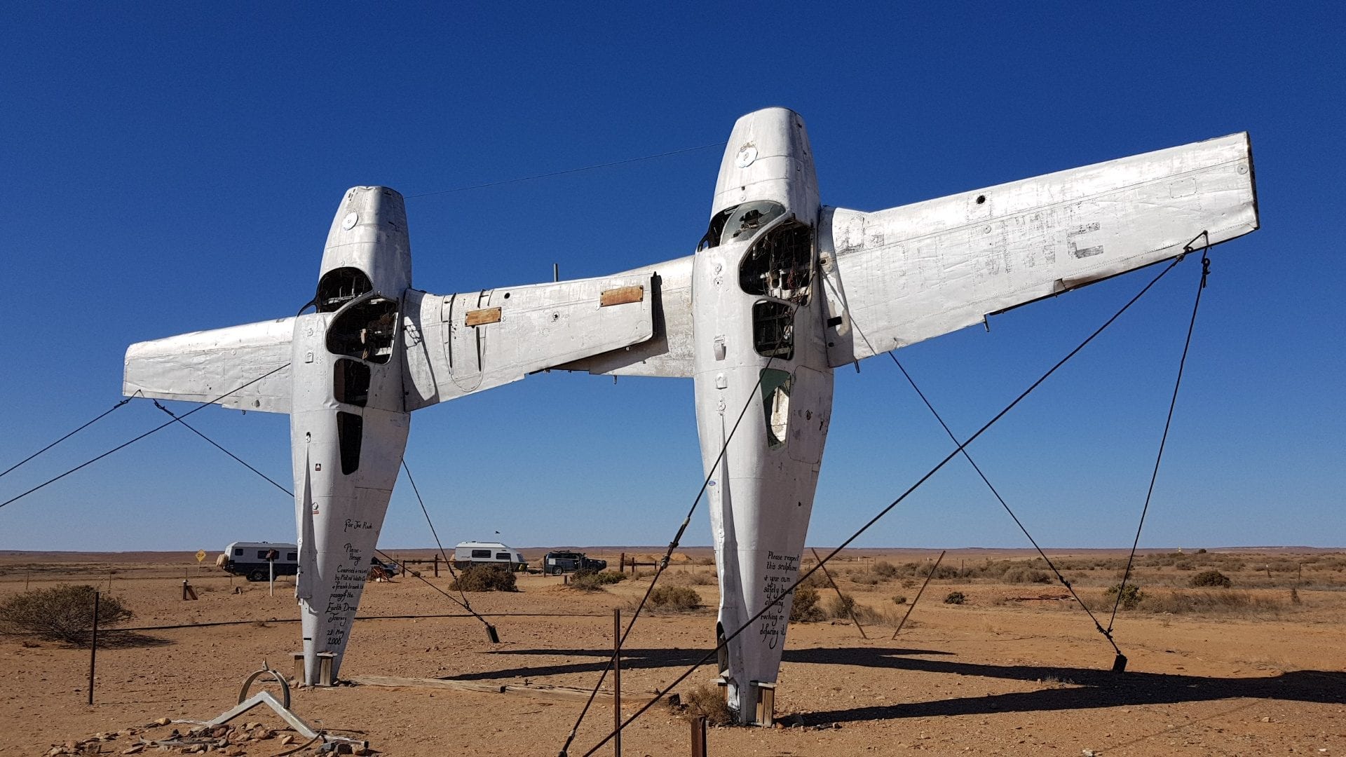 after leaving Coward Springs we travel down to the southern most point of Lake Eyre where there was no water. From there we went to sculptures on the Oodnadatta track which you can see the different sculptures 2 aeroplanes touching wings and other different things.