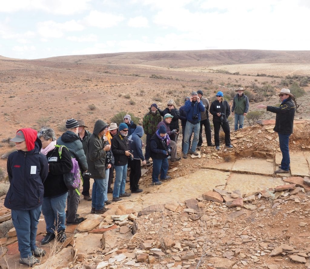635–545 million years ago and named after the Ediacara hills of the Flinders Ranges. These fossil fields were included on the National Heritage list in 2007, are a subject of Sir David Attenborough’s First Life BBC series, and are a core aspect of the South Australian Government’s 2018 nomination of the Flinders Ranges for World Heritage listing. The group was fortunate to have Ross as our guide and we spent several hours being immersed not only in the history of the site and its global value but also learning how it was discovered by Ross and the challenges that had to be overcome over many years to finally be able to safely and securely open up the site to visitors.