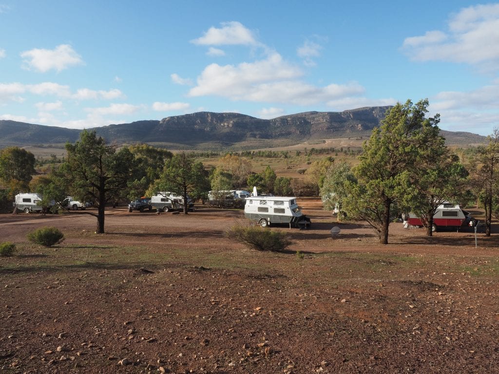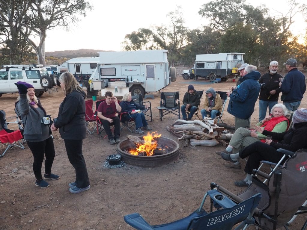 Our camping area at Rawnsley Park was cut into the side of a hill which gave us some great views towards Rawnsley bluff and the Chace range. Ian and Madelaine Baker volunteered to act as ‘sweep’ today and were rewarded with the best site offering clear views to some great Flinders Ranges vistas. The weather was on the improve but cold, so a cunning plan was formed to use the remaining level campsite as the fire pit cum meeting area for the duration of our stay. Several owners had varying forms of portable fire pits and after some wine-inspired discussion it was decided to establish, once and for all, if there was any difference between cooking with charcoal or wood. The details are already lost in the mist of time but a synopsis goes something like this. Charcoal was quicker to generate heat and get the fire to the stage where you could cook on it as well as providing more consistent heat for longer. Wood took a lot longer; we had cooked a meal on the charcoal-powered one by the time the timber had got to suitable coals but most agreed that watching the flames in the wood fire was a nice thing. Outcome is, if you want to watch a fire, use wood; but if you want to cook and keep warm, charcoal offers a great alternative.