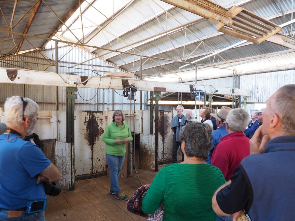 From Rawnsley Park our third transit was a short run up the bitumen to Alpana Station, five kilometres out of the historic copper town of Blinman. As it was a short travel day some took the opportunity to fly over Wilpena Pound from Rawnsley Park and others experienced the Blinman Mine tour; the mine guides took two groups on separate days. Exploring the surrounding area, including Glass gorge and the various scenic drives, sampling the quandong pies at the Blinman shop and lunch/dinner at the pub were all on respective agenda. As the wind abated for a while we also took the group up to the high point on Alpana where there are views of the surrounding ranges and out to Lake Torrens. What made that vista fascinating was that it offered views of the next approaching storm cell led by a large, imposing wall of dust heading our way from the west. Sally Henery, one of the owners of Alpana, took us on a guided tour of their historic shearing shed, explaining the workings of a modern-day sheep property including the many challenges of not only finding enough stock food but mustering in this challenging country. The Henerys have been custodians of their land for over six generations and 140 years, starting the property in 1878 and growing it to this day. After dinner it started to drizzle rain, a rare event here at this time of year, causing some discussion on how we would travel to the Prairie Hotel tomorrow if the track was too wet. Listening to the patter of raindrops on the camper roof made for a bit of a nervous night.